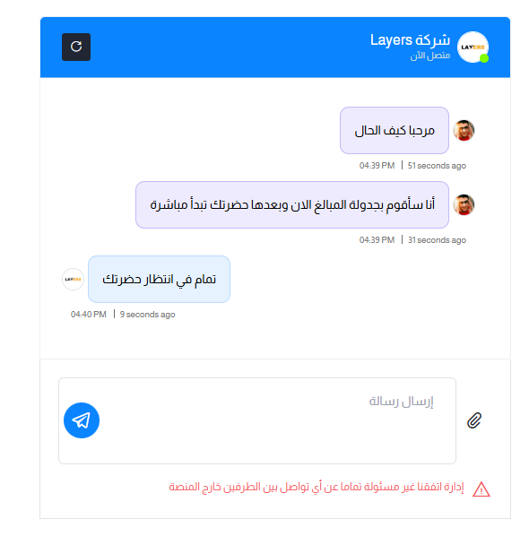 هذه الرسالة تهدف لتوضيح أن أي تعامل أو تواصل يتم خارج نظام المحادثة داخل المنصة لا يخضع للرقابة أو الحماية القانونية الخاصة باتفقنا.