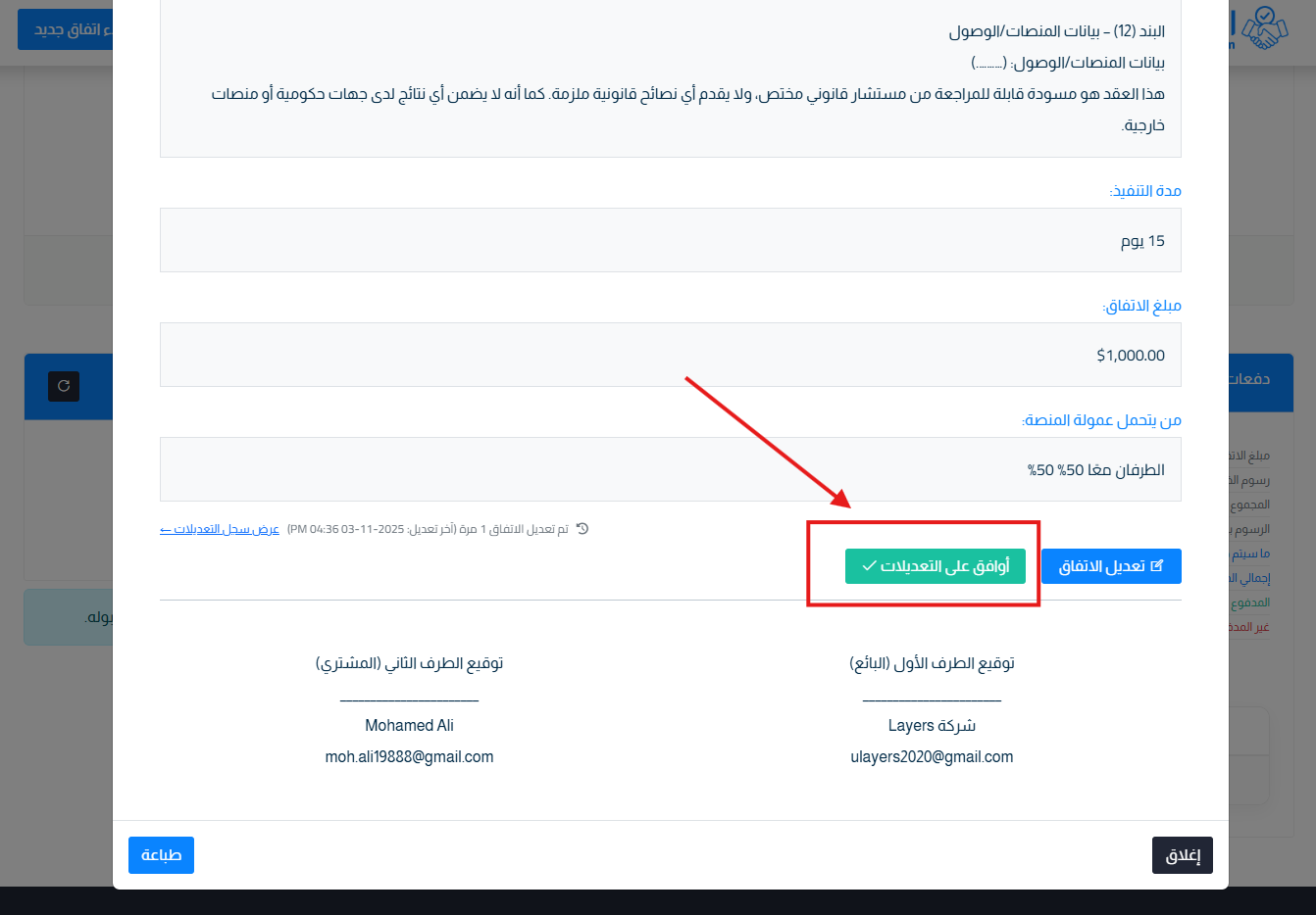 - يظهر زر “الموافقة على التعديلات” بجانب زر “تعديل الاتفاق” للطرف الذي لم يقم بالتعديل.