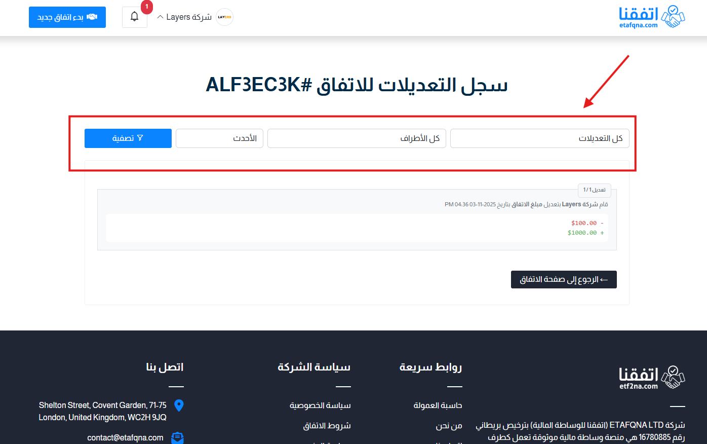 مثل عرض التعديلات الخاصة بالمبلغ، المدة، البنود، العنوان أو من سيتحمل العمولة. - فلترة حسب الطرف الذي قام بالتعديل: