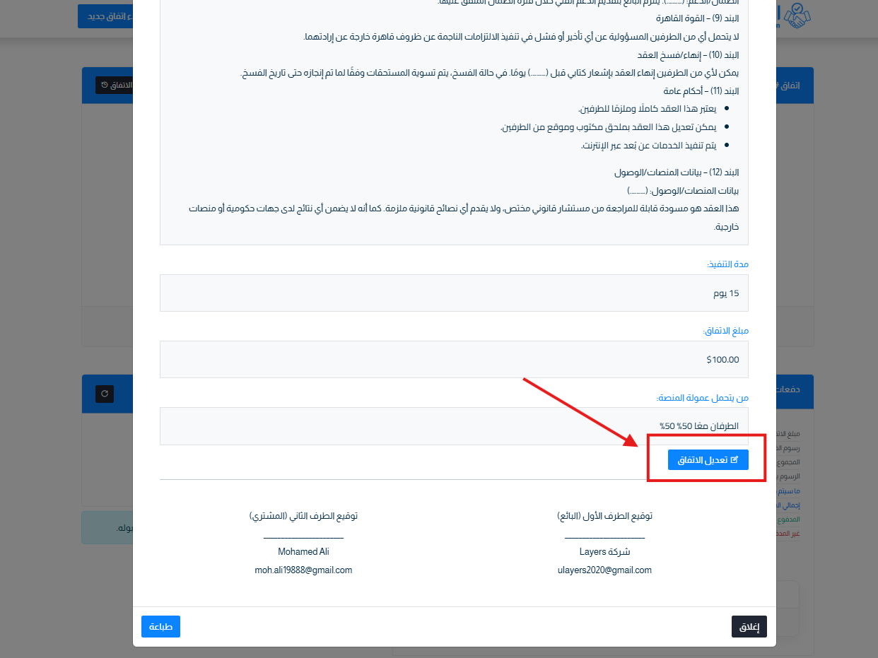 عند الضغط على الزر، يظهر نافذة منبثقة (بوب أب) تحتوي على نص الاتفاق الكامل في شكل عقد اتفاق واضح ومنسق ويمكن طباعته أو تعديله.