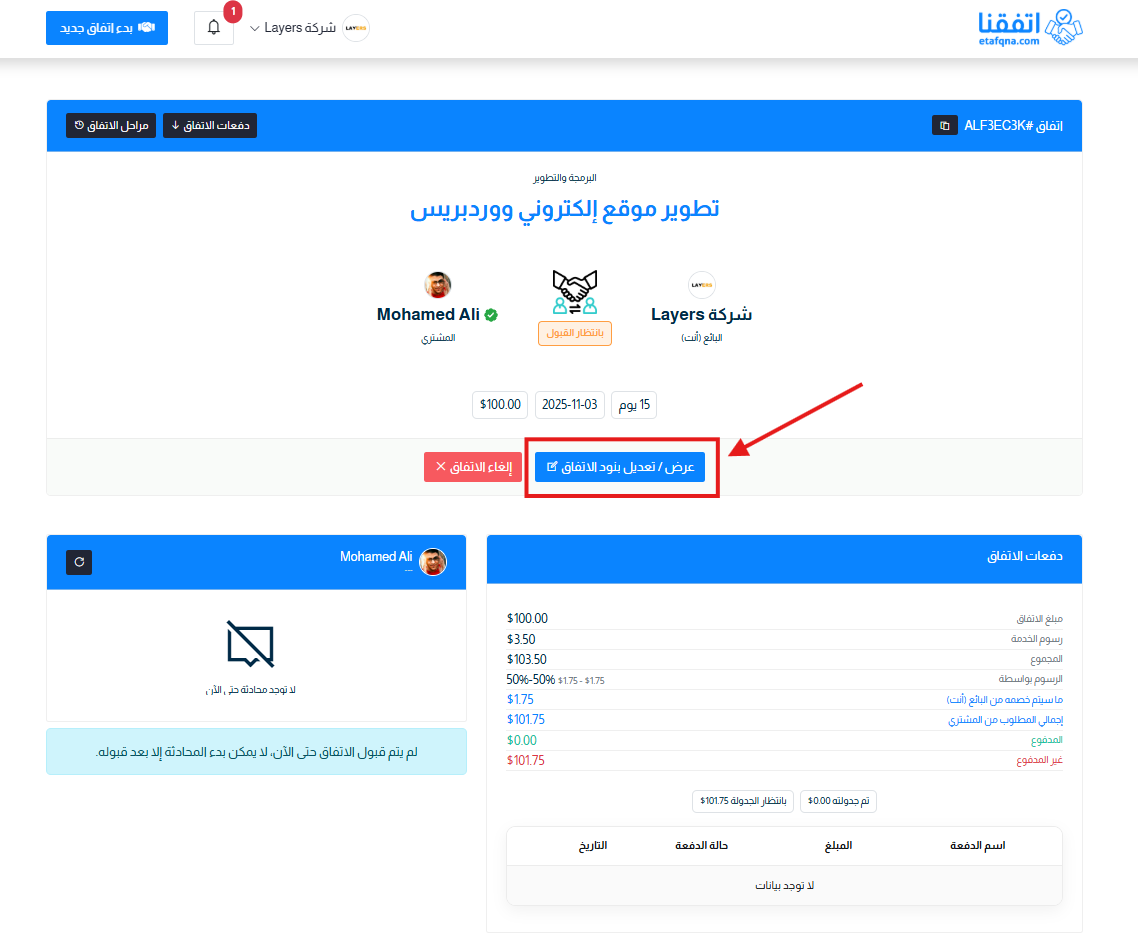 أسفل نافذة العقد، يوجد زر بعنوان “تعديل الاتفاق”، وهذا الزر يظهر فقط طالما أن الاتفاق ما زال بانتظار القبول.