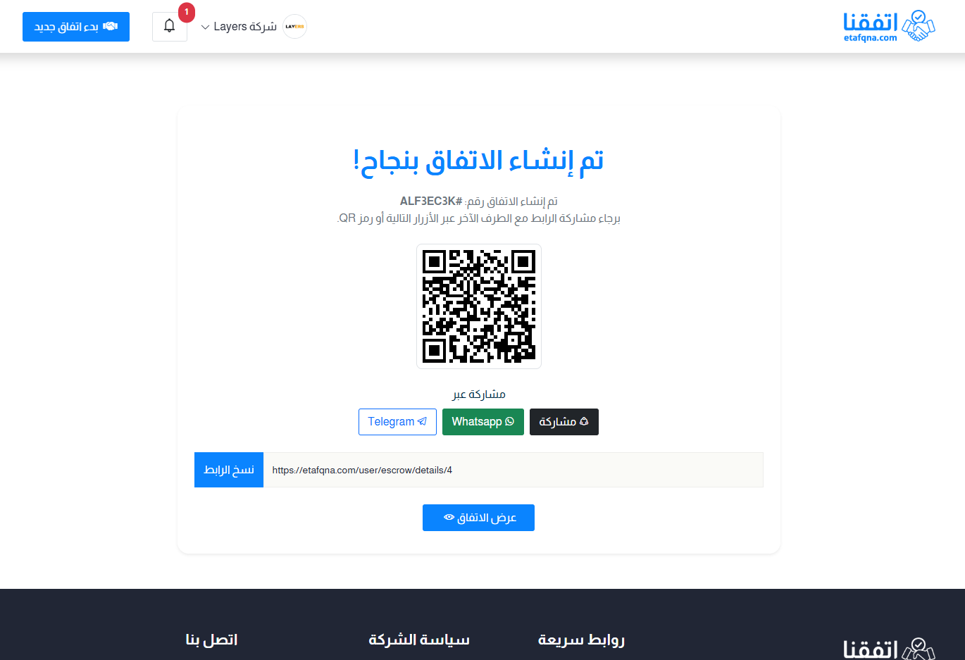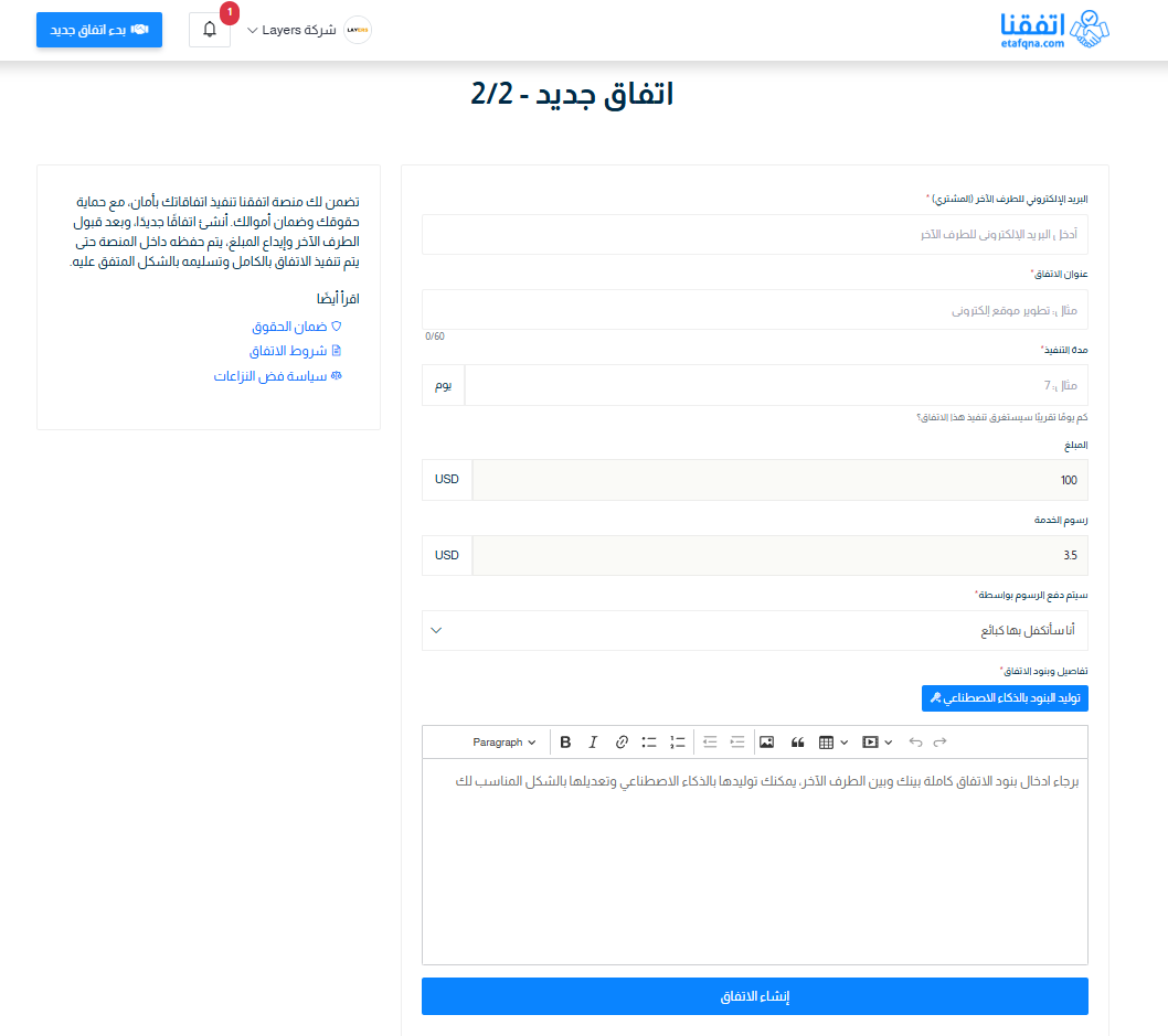 باتباع هذه الخطوات تكون قد أنشأت اتفاقًا جديدًا داخل منصة اتفقنا بنجاح،
