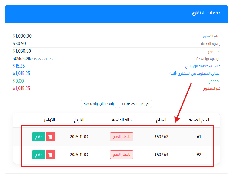 بعد الانتهاء من الجدولة واعتمادها، يصبح كل بند في الجدول قابلًا للدفع بشكل مستقل عبر الزر المخصص لكل دفعة.