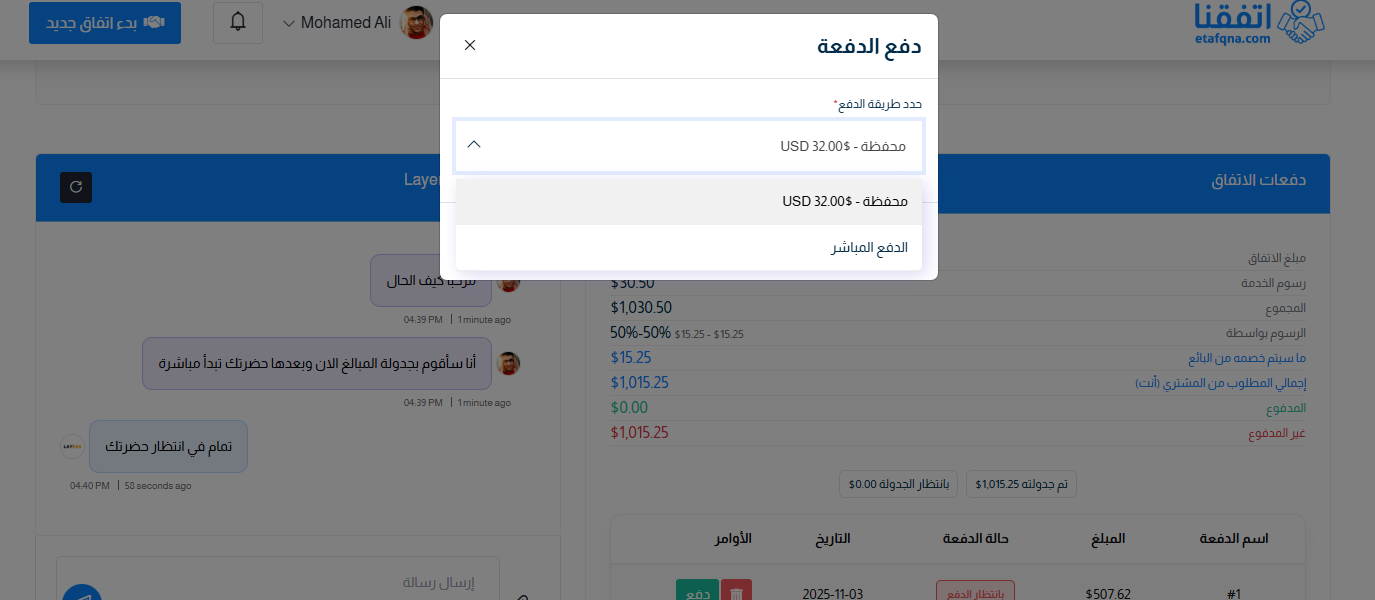 - جميع عمليات الدفع مسجلة بدقة في صفحة الاتفاق ويمكن مراجعتها في أي وقت.